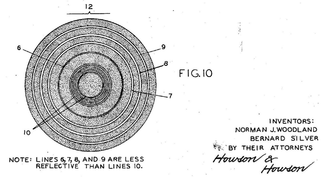 La storia del codice a barre inizia tuttavia ben prima, portando con sé un particolare stilistico curioso. Il pioniere di questo sistema di codifica fu Norman Joseph Woodland (1921-2012), ingegnere che mise a punto una prima versione del sistema pensando al funzionamento del codice Morse. Il brevetto originario di barcode – registrato nel 1949 – aveva l’aspetto di un bersaglio, nel quale la codifica di un dato era ottenuta attraverso la combinazione di cerchi concentrici. Questa versione non si rivelò del tutto efficace e non venne mai utilizzata fuori da un laboratorio. Woodland, nel frattempo passato in forze all’IBM, lasciò il progetto in eredità ai suoi colleghi. Fra questi, fu George Laurer a mettere a punto il barcode di forma rettangolare utilizzato per la prima volta nel 1974 e che tutti conosciamo.