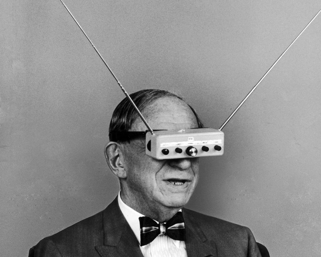 [ illustrazione: l’inventore americano Hugo Gernsback indossa un paio di “television eyeglasses”, 1963 ]