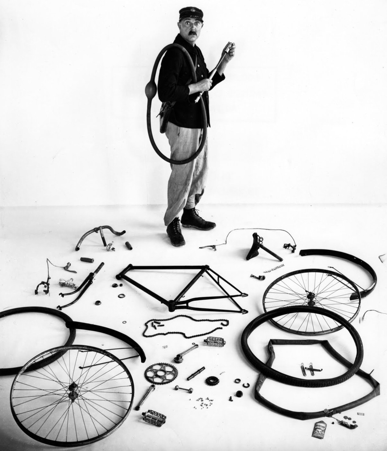 [ illustrazione: Jacques Tati alle prese con la sua bici ]
