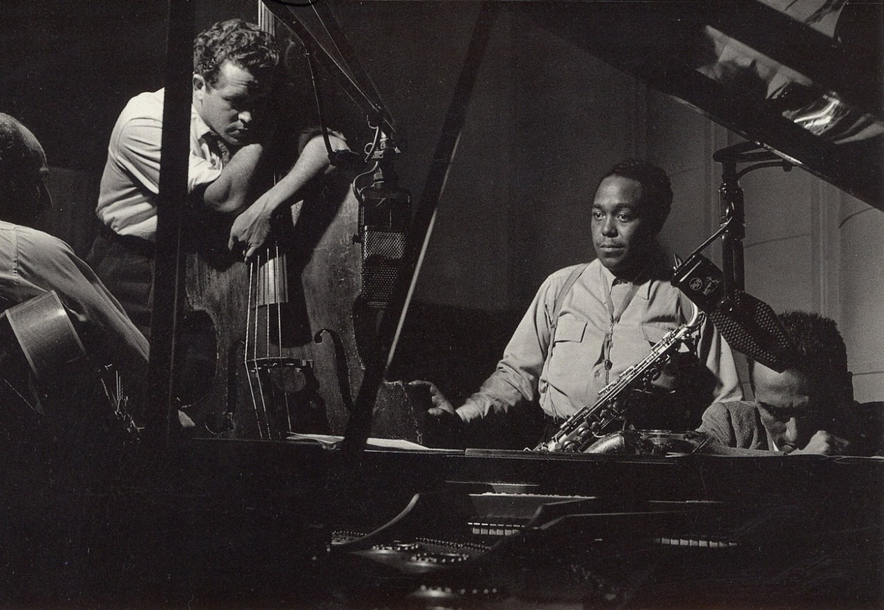 [ illustrazione: da sinistra a destra, Billy Bauer, Eddie Safranski, Charlie Parker e Lennie Tristano, New York, 1949 – foto di Herman Leonard ]