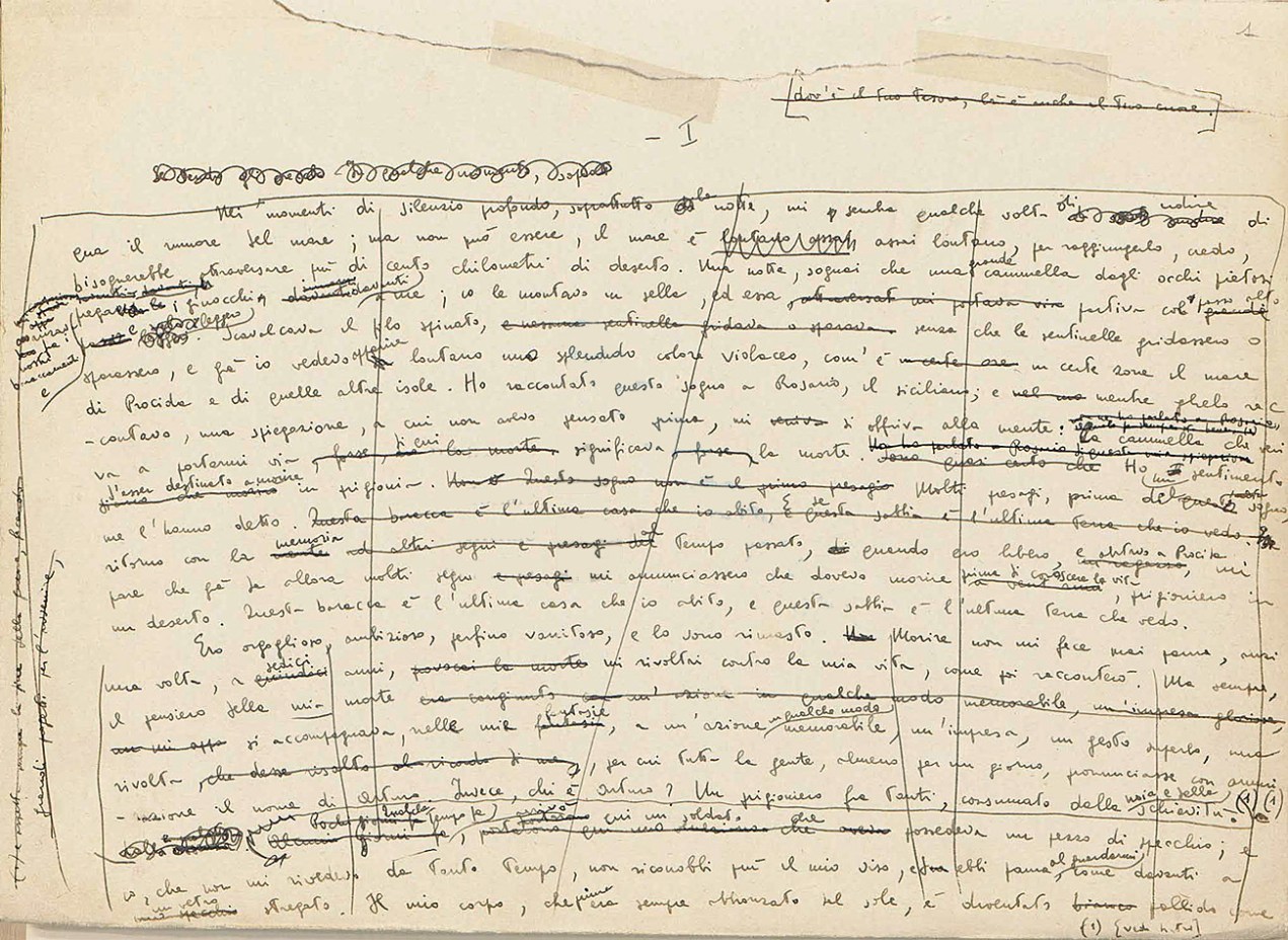 [ illustrazione: foglio dal manoscritto di Elsa Morante per L’isola di Arturo, edito nel 1957 ]